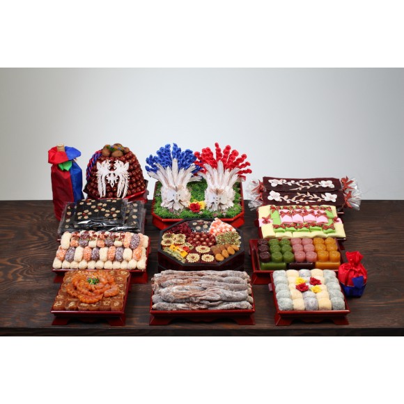 삼색유과, 곶감말이, 정일품육포, 대추고임, 닭고임, 두텁떡, 폐백술, 밤대추주머니